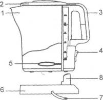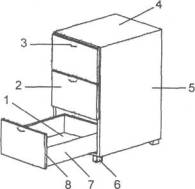 Рис. П. 1.23. Тумбочка прикроватная: 1 - дно ящика; 2 - передняя стенка ящика; 3 - ручка ящика;4 - крышка тумбочки; 5 - боковая стенка тумбочки; 6 - ножка; 7 - боковая стенка ящика; 8 - торец передней стенки