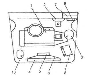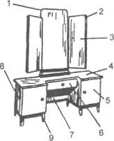 Рис. П. 1.24. Трельяж: 1 - центральное зеркало; 2 - правая створка; 3 - зеркало створки;4 - крышка; 5 - правая дверца; 6 - передняя стенка наружного ящика; 7 - задний щит; 8 - боковая стенка; 9 - ножка