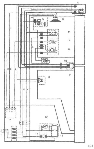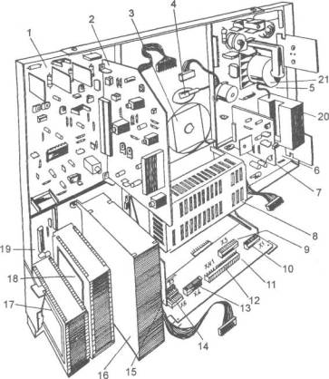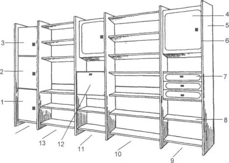 Рис. П. 1.26. Мебельная стенка: 1 - нижняя дверца 1-й секции; 2 - средняя дверца 1-й секции; 3 - верхняя дверца 1-й секции; 4 - дверца верхнего отдела 5-й секции; 5 - боковая стенка; 6 - передняя кромка боковой стенки; 7 - ящик выдвижной (передняя стенка); 8 - полка; 9 - 5-я секция; 10 - 4-я секция; 11 - 3-я секция; 12 - откидная дверца; 13 - 2-я секция; 14 - 1-я секция