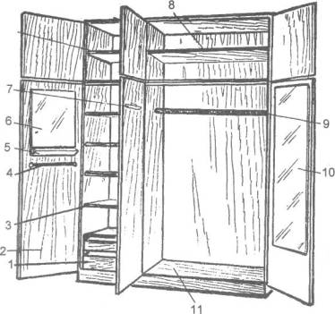 Рис. П.1.27. Шкаф трехдверный с антресолью: 1 - полуящик; 2 - дверь шкафа; 3 - полка выдвижная;4 - галстукодержатель; 5 - лоток для мелочей; 6, 10 - зеркала; 7 - дверца антресоли; 8 - полки антресоли стационарные;9 - скалка для плечиков; 10 - полшкафа 1.3. ЭлектросетиВоздушные и кабельные вводы