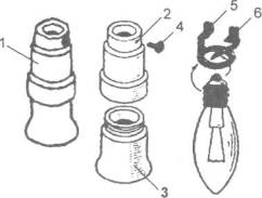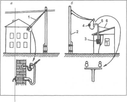 Рис. П. 1.28. Воздушные вводы в дома: а - ввод в дом от воздушных линий; 6 - ввод в домик на садовом участке; 1 - изолированные провода; 2 - опора; 3 - вводный ящик; 4 - зажим; 5 - трубостойка; 6 - оттяжка
