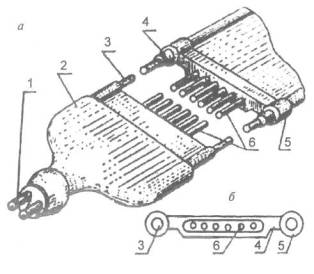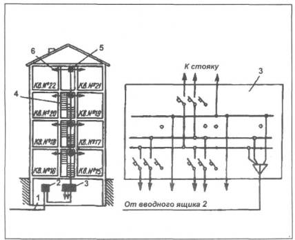 Рис. П. 1.29. Кабельный ввод в большой дом: 1 - питающий кабель; 2 - вводный ящик; 3 - распределительный щит; 4 - стояки; 5 - этажные щитки; 6 - провода, расходящиеся по квартирам