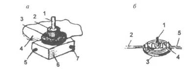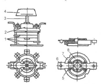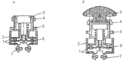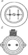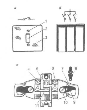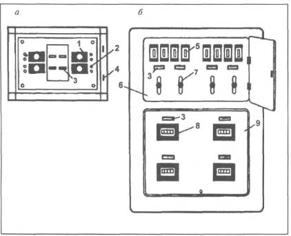 Рис. П. 1.30. Этажные щитки: а - с одним отсеком; б - с двумя отсеками; 1 - предохранители; 2 - отверстия для ввода проводов;3 - надписи с номерами квартир; 4 - петли; 5 - автоматические выключатели; 6 - верхний отсек;7 - выключатели; 8 - окна в панели;9 - панель
