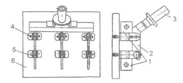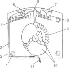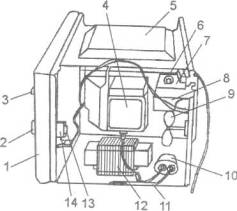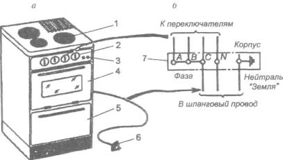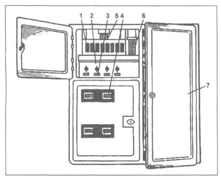 Рис. П. 1.31. Электрошкаф: 1-автоматические выключатели; 2 - выключатели; - таблички с номерами квартир; 4 - счетчики; провода, идущие в квартиры; 6 - провода стояка; 7 - дверца третьего отсека Схемы электросети