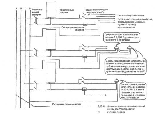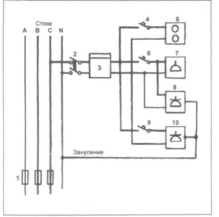 Рис. П. 1.32. Пример схемы квартирной групповой сети современного дома и ее присоединение к стояку: 1 - предохранители; 2 - двухполюсный пакетный выключатель; 3 - счетчик на номинальный ток 10 А; 4 - автоматический выключатель; 5 - питающая лампа общего освещения; 6 - автоматический выключатель на 16 А; 7 - штепсельные розетки; 8 - розетки в кухне; 9 - автоматический выключатель на 32 А; 10 - штепсельная розетка с защитным контактом для электроплиты