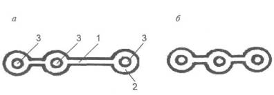 Рис. П. 1.35. Плоские многожильные провода: а - плоский трехжильный провод с изоляцией с разделительным основанием; б - провод без разделительного основания; 1 - разделительное основание; 2 - изоляция; 3 - жила
