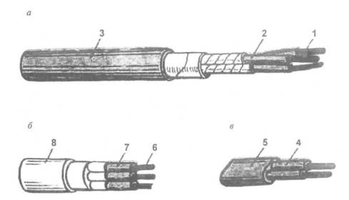 Рис. П. 1.36, Примеры исполнения кабелей: а - НРГ, АНРГ; б - СРГ, АСРГ; в - ВВГ, АВВГ; 1 - жилы; 2 - резиновая изоляция; 3 - резиновая оболочка; 4 - изоляция из ПВХ; 5 - оболочка их ПВХ; 6 - жилы; 7 - резиновая изоляция; 8 - свинцовая оболочка