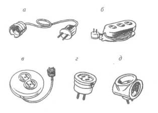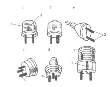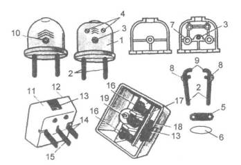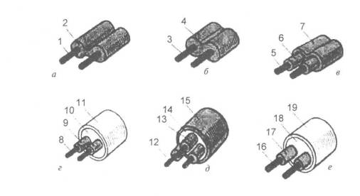 Рис. П. 1.37. Шнуры для электроприборов: а - ШВП-2; б - ШВП-1; в - ШВВП; г - ШРО; д - ШПС и ПВС; е - ШТР; 1,3- жилы; 2, 4 - ПВХ-пластикат; 5, 12 - жилы; 6, 13 - ПВХ-изоляция; 7, 15 - ПВХ-оболочка; 8, 16 - скрученные жилы; 9 - резиновая изоляция; 10, 14 - заполнение из синтетического волокна; 11 - оплетка из х/б или синтетической нити; 17 - изоляция; 18 - заполнение синтетическим волокном; 19 - оболочка Таблица П.1.1Диаметр проводника и соответствующее ему сечение