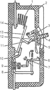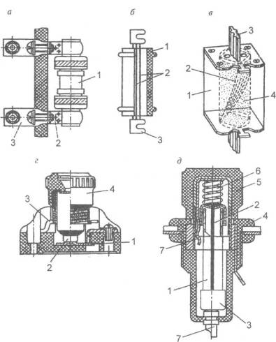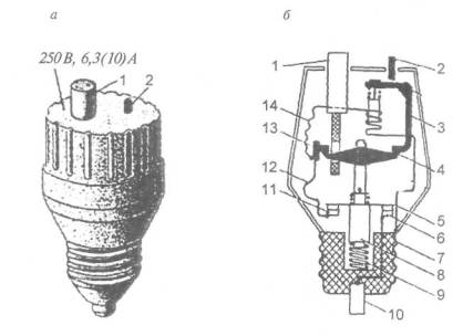 6.1. Электрические щитыЭлектрощиты в основном подразделяются на щиты вводно-распределительных устройств (ВРУ), главные распределительные щиты (ГРЩ), распределительные щиты (РЩ), щиты освещения (ЩО), щиты силовые (ЩС), а для организации электроснабжения жилых домов - на групповые щиты, этажные щитки, квартирные щитки и т. д. Для вводной части электрощитов основными элементами являются рубильник или переключатель с предохранителями, автоматический выключатель, приборы измерения и учета. Основными элементами распределительной части являются автоматы или предохранители, собранные в группы [97]. Осмотр электрощитов следует начинать с ближайшего к месту пожара и заканчивать главным электрощитом или подстанцией. При осмотре на месте пожара в протоколе отмечается: - тип и назначение электрощита; - перечень входящих в его состав коммутационных устройств и других элементов; - схема щита и перечень потребителей электроэнергии от данного щита; - в состояние корпуса щита (наличие следов термического воздействия на лакокрасочное покрытие корпуса); - наличие на корпусе следов оплавлений и прожога металла, а также капель и брызг металла шинопроводов, проводников подходящих и отходящих кабелей и других признаков дугового процесса; - наличие следов локального термического нагрева в местах подключения проводников подходящих и отходящих кабелей к шинопроводам; - наличие оплавлений проводников подходящих и отходящих кабелей; - состояние контактных элементов (надежность контакта) подключения нулевого провода; - состояние изоляции нулевого провода и металла его проводника. При небольших габаритах щита он изымается целиком, если габариты не позволяют сделать этого, то производится детальная съемка щита, а элементы и узлы, представляющие интерес для исследования, изымаются. Состояние электрических аппаратов и узлов, установленных внутри щита на месте пожара, описывается отдельно. Применяемые в электрощитах низковольтные (до 1000 В) электрические аппараты делятся на неавтоматические и автоматические. Из неавтоматических аппаратов наиболее широко распространены рубильники, переключатели, пакетные выключатели, выключатели и предохранители [43, 97]. Рубильники и переключатели выпускают с центральной или боковой рукояткой, центральным или боковым рычажным приводом. Маркировка рубильников и переключателей: Р - рубильник с центральной рукояткой; РБ - с боковой рукояткой; РПБ - с боковым рычажным приводом; РПЦ - с центральным рычажным приводом; П - переключатель. Маркировка по положению рукоятки и рычажного привода для переключателей аналогична рубильникам. Первая цифра после букв означает количество полюсов (1, 2, 3), вторая - величину номинального тока аппарата [97]. При осмотре рубильников и переключателей на месте пожара отмечается: - положение рукоятки управления (включено, выключено, промежуточное состояние); - состояние контактных поверхностей ножей и контактных губок, наличие на них копоти и частиц оплавленного металла и других признаков дугового процесса; - изменение сечения контактных частей ножей и губок вследствие оплавления металла; - состояние шарнирных соединений, являющихся частью цепи, по которой проходит электрический ток; - состояние пружинящих скоб контактных губок (недостаточное нажатие может быть причиной повышенного нагрева 