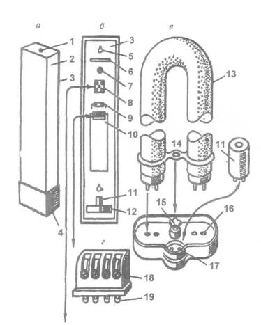 Рис. 12.1. Ультразвуковой дефектоскоп УК-10ПМС (основной прибор и электроакустические преобразователи) Некоторые приборы, например, ультразвуковой тестер УК-1401, имеют датчики, встроенные в основной прибор. Краткая методика работы На месте пожара: а) намечаются конструкции для обследования; б) составляется план конструкции (потолка, стены) в масштабе; в) на конструкции намечаются участки, в которых будет производиться прозвучивание. Обычно расстояние между участками (так называемый "шаг прозвучивания") составляет 25-50-100 см (в зависимости от размеров конструкции и конкретных обстоятельств). Далее включается дефектоскоп, шаблон с датчиками прижимается к конструкции на первом намеченном участке и производится измерение времени прохождения ультразвукового импульса от датчика к датчику (в микросекундах) или скорости импульса. Результаты измерений на всех намеченных участках - значения т или относительной скорости прохождения ультразвуковых волн Сr/С0, рассчитанной как отношение скорости на данном участке Сr к скорости в зоне, не подвергшейся нагреву С0, наносятся на план обследуемой конструкции. На плане выделяются зоны с Сr /С0 - 1,0-0,9; 0,9-0,8; 0,8-0,7 и т. д., либо зоны с различными значениями т. Зона наибольших термических поражений соответствует зоне наибольших значений т или наименьших значений Сr /С0. Получаемая информация Зоны термических поражений бетонных и железобетонных конструкций на месте пожара. Полученные данные по распределению зон термических поражений сопоставляются с распределением пожарной нагрузки и используются в поисках очага пожара. Ударно-акустический метод Ударно-акустический метод применяется в строительстве для определения твердости бетона и железобетона. Учитывая, что твердость этих материалов снижается при тепловом воздействии на них в ходе пожара, метод может быть применен для оценки степени их термического поражения. Объекты исследования Конструкции из бетона и железобетона заводского производства. Применяемые приборы - Измеритель прочности бетона ИП-1 (разработка Самарского архитектурно-строительного университета) и другие подобные приборы. - Цифровые тестеры прочности фирм PROSEQ (Швейцария) или SCHMIDT (Германия). Приборы портативные, полевые, масса 1,0-2,0 кг. Краткая методика работы Аналогично УЗ-дефектоскопии на месте пожара намечаются конструкции для обследования; составляется план конструкции (потолка, стены) в масштабе; на конструкции намечаются участки, в которых будет производиться исследование. В намеченных точках измеряется твердость материала. Время одного измерения 5 с; делается 5-6 измерений, вычисляется среднее значение. Полученные результаты наносятся на план места пожара. Получаемая информация Метод позволяет уверенно дифференцировать две зоны пожара - "холодную" (ниже 600-700 °С) и "горячую" (выше 600-700 °С). По информативности данный метод уступает УЗ-дефектоскопии. 12.2. Исследование стальных конструкций и изделийМагнитный метод (измерение коэрцитивной силы или тока размагничивания) Метод основан на измерении коэрцитивной силы или тока размагничивания предварительно намагниченного стального изделия. Самый удобный метод определения относительной степени рекристаллизации холоднодеформированных изделий в пожарно-криминалистических исследованиях. Объекты исследованияХолоднодеформиро