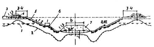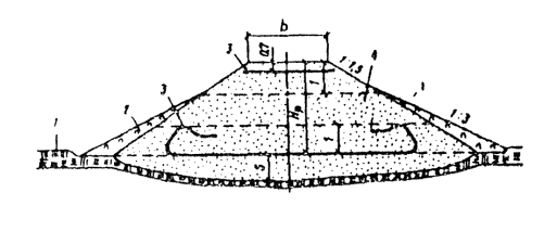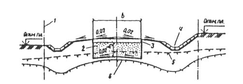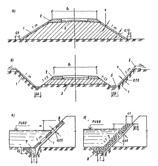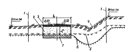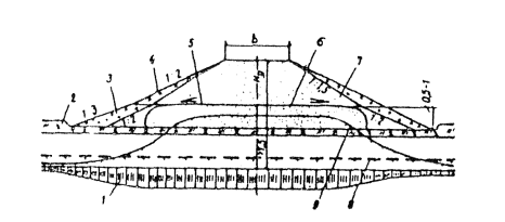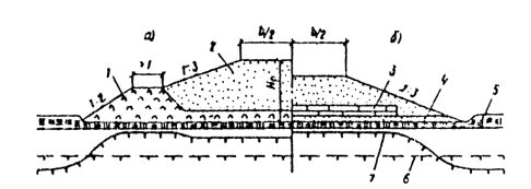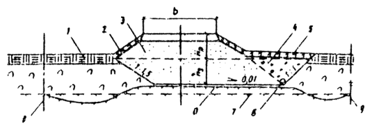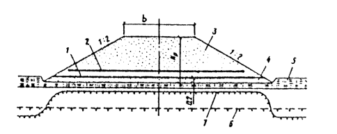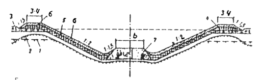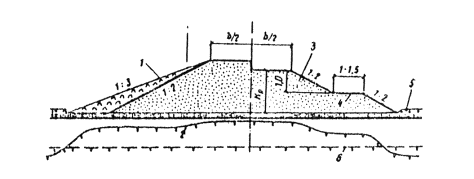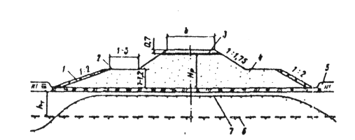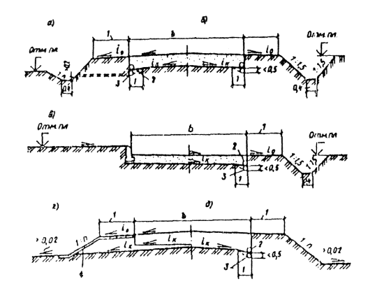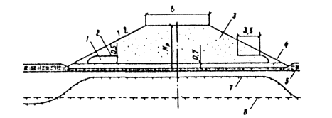 4.15. Ширину основной площадки земляного полотна можно назначать расчетом по формулам, приведенным в п.2.47, а запас по высотe насыпи в п.2.49. Конструкция земляного полотна 4.16. Конструкции земляного полотна следует проектировать исходя из категории по термопросадочности мерзлых: грунтов при оттаивании и свойств грунтов для возведения насыпей и устройства выемок. Типовые конструкции земляного полотна автомобильных дорог приведены в приложении 13, рис. 1-8. 4.17. Насыпи высотой более 1,5 м на вечномерзлых грунтах IV и V категорий по термопросадочности (приложение 7) из дренирующих грунтов, по первому принципу строительства, с бермами и утеплителей откосов из торфа, приведены в приложении 13, рис.1. 4.18. Конструкция насыпи высотой более 1,5 м на вечномерзлых грунтах IV и V категорий термопросадочности предусматривает укладку в основании пенопласта, или берму из торфа, добываемого на месте из резервов, с соответствующей воздушной просушкой до влажности 5-10% по массе, приложение 13-2. 4.19. Конструкция насыпи высотой более 1,5 м на грунтах III, IV и V категорий по термопросадочности из талых, сыпуче- или сухомерзлых песчаных грунтов с применениям геотекстиля, укладываемого в продольном направлении оси дороги в виде двух слоев на выравненный песчаный слой и выше через слой грунта мощностью 0,5-0,7 м, приведена в приложении 13-3. 4.20. Конструкция насыпи высотой более 1,5 м на грунтах III категории по термопросадочности, из сухих талых сыпуче- или сухомерзлых песчаных грунтов, с устройством в нижней части обоймы из геотекстиля мощностью 0,5 м, приведена в приложении 13, рис.4, а на грунтах IV и V категорий с устройством обоймы из геотекстиля с заключением глинистых грунтов, мощностью 0,5-1,0 м, приведена в приложении 13, рис.5. 4.21. Конструкция насыпи высотой более 1,5 м на грунтах II и III категорий по термопросадочности разработана с отсыпкой из дренирующих и суглинистых грунтов и рассчитана на осадку основания насыпи, приведена в приложении 13, рис.6. 4.22. Конструкции насыпей на застраиваемой территории, на грунтах III-IV категорий по термопросадочности с заменой грунтов на дренирующие и термоизоляцией, приведены в приложения 13, рис.7 и 13, рис.8. 4.23. Конструкции земляного полотна на планируемой территории, без кюветов, с дренажными трубами, и без них, с выпуском воды в ливневую канализацию, по принципу предварительного оттаивания вечномерзлых высокотемпературных грунтов (выше-0,5°С), приведены в приложении 14, рис.1 и 14, рис.2. 4.24. Конструкции земляного полотна на границе планировки территории промышленного предприятия или террасы в выемке (насыпи), с укладкой железобетонных лотков и трубофильтров, с выпуском воды в ливневую канализацию, приведены в приложениях 14, рис.3 и 14, рис.4. 4.25, Конструкции откосов укрепленных неткаными синтетическими материалами - геотекстилями (неподтопляемые откосы, обводненные выемки, подтопляемые откосы), приведены в приложении 15, а конструкции дренажей - в приложении 16. ТРЕБОВАНИЯ К ГРУНТАМ 4.26. Грунты как основания земляного полотна классифицируется по термопросадочности на пять категорий: непросадочные, малопросадочные, просадочные, сильнопросадочные и чрезмернопросадочные и отличаются по показателю относительной просадочности, льдистости и суммарной влажности, приложение 7 и должны учитываться при разработке конструкций земляного полотна. 4.27. Относительну