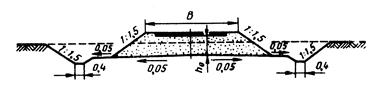Рис.3. Поперечный профиль выемки в грунтах повышенной влажности 3.5. В зависимости от степени переувлажнения глинистого грунта по высоте насыпи выделяют две зоны: консолидируемую (активную) - с толщиной hK и неконсолидируемую (пассивную) - hН (см. рис.2). В неконсолидируемой зоне отсутствует процесс уплотнения связных грунтов во времени под действием их собственной массы. Толщина неконсолидируемой зоны hН (м) зависит от вида грунта, степени его переувлажнения, плотности и с учетом величины предельной пороговой нагрузки Р0 (Па) (см.п.2.8) может быть определена по формуле