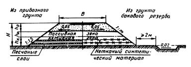 Рис.1. Поперечный профиль насыпи из привозного грунта и с частичной заменой грунта высокой влажности