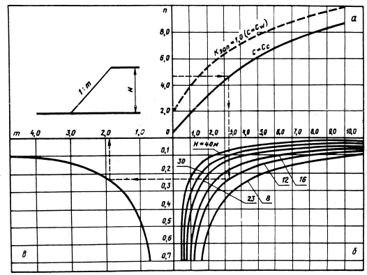 Для определении крутизны стабильного откоса (1 : m) на графике (а) номограммы (см. рис.5) находят точку, соответствующую расчетной величине n, на графике (б) - точку. соответствующую высоте насыпи Н. и на графике (в) - величину 1 : m. Если по номограмме крутизна