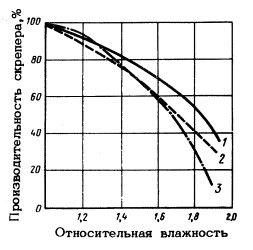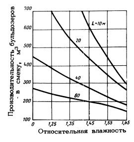 Рис. 6. Характер зависимости производительности бульдозеров ДЗ-17 и ДЗ-53 от влажности грунта (грунт - пылеватые суглинки; L - расстояние перемещения/ 4.11. Разработку грунта повышенной влажности в выемках или притрассовых карьерах и перемещение его в насыпь или кавальер на расстояние 80-600 м целесообразно выполнять прицепными скреперами, на расстояние 600-3000 м - полуприцепными и самоходными скреперами. При этом прицепными скреперами с гусеничной тягой возможно разрабатывать связные грунты допустимой и средней, а несвязные грунты - любой степени переувлажнения; самоходными скреперами - связные грунты допустимой, а несвязные - допустимой и средней степени переувлажнения. Разработка грунтов повышенной влажности скреперами выполняется без предварительного рыхления, с использованием толкачей на гусеничном ходу. 4.12. Производительность скреперов существенно снижается при повышении влажности глинистых грунтов (рис.7). Основными причинами снижения производительности скреперов являются повышенная липкость грунта и ухудшение проходимости машин вследствие усиления колееобразования. Уменьшить влияние этих факторов можно путем гидрофобизирующей смазки внутренней поверхности ковша, а также снижением давления в шинах до 2,5.105 - 3.105 Па (2,5 - 3,0 кгс/см2).