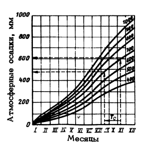 Рис.8. Нарастающее количество атмосферных осадков по месяцам (числа на кривых - годовая норма осадков)