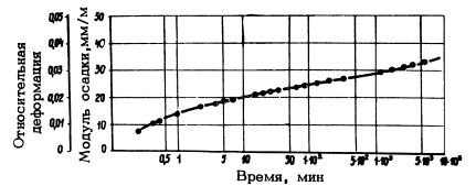 Рис.3. Зависимость относительной деформации и модуля осадки от времени