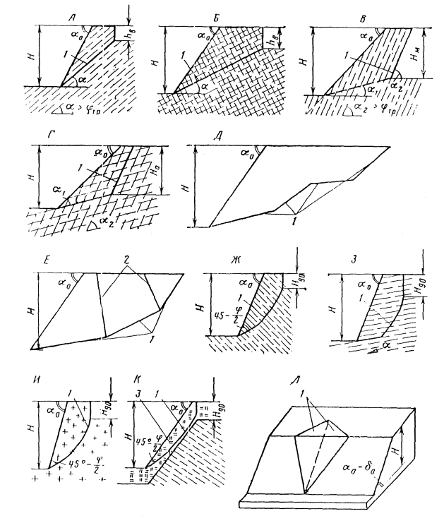 определяемый при условии 5<0. 3.13. Расчет общей устойчивости скальных откосов и склонов необходимо начинать с установления положения поверхности обрушения (скольжения) - поверхности, по которой соотношение сил, удерживающих откос в равновесии, и сдвигающих является минимальным. Положение в массиве поверхностей обрушения и их очертание предопределяются в основном геологическим строением пород - благоприятной или неблагоприятной ориентацией по отношению к откосу поверхностей ослабления (трещиноватости, слоистости). Поверхность обрушения скального откоса (склона), как правило, совпадает с существующими в массиве поверхностями ослабления на всем своем протяжении. В тех случаях, когда смещение по существующим в массиве плоскостям ослабления кинематически невозможно или связано с разрушением скального материала, поверхность обрушения может представлять собой вновь сформировавшуюся трещину скола - (отрыва), не совпадающую с существующими в массиве поверхностями ослабления либо совпадающую с ними лишь частично. 3.14. Под благоприятным залеганием поверхностей ослабления понимается следующее их расположение: - наклонное в сторону массива (запрокинутое); - наклонное в сторону откоса под углом, меньшим угла внутреннего трения по поверхности ослабления; - вкрест простирания поверхности откоса, за исключением случаев, когда поверхности ослабления пересекают поверхности откосов под углами, меньшими 30°, и одновременно имеют угол падения в направлении откоса, превышающий угол внутреннего трения по поверхности ослабления. 3.15. Под неблагоприятным залеганием поверхностей ослабления понимается наклонное; их расположение в сторону откоса под углом, превышающим угол внутреннего трения, а также расположение вкрест простирания с поверхностью откоса, когда поверхность ослабления пересекает поверхность откоса под углом, меньшим 30°, и одновременно имеет угол падения в направлении откоса, превышающий угол внутреннего трения по поверхности ослабления [29, 30]. 3.16. При оценке общей устойчивости скальных откосов рекомендуется руководствоваться расчетными схемами, представленными на рис. 1 [31-36]. 3.17. Способы построения вероятных поверхностей обрушения скальных откосов для некоторых расчетных схем, изображенных на рис. 1, помещены в приложении 3. Условия применения указанных схем приведены в табл. 3. 3.18. Методы расчета общей устойчивости скальных откосов (и склонов) основываются на следующих положениях: - нарушение устойчивости откоса происходит в виде обрушения или оползания слагающих пород по поверхности смещения; - при наличии в откосе неблагоприятно ориентированных трещин поверхности смещения, как правило, совпадают с ними; в этих случаях поверхность смещения (на поперечном разрезе) будет иметь вид прямой или ломаной линии; - при отсутствии в откосе неблагоприятно расположенных трещин поверхности смещения на тех участках, где они не совпадают с существующими трещинами, являются монотонными, близкими по форме к круглоцилиндрическим; - при расчетах задача рассматривается как плоская, т.е. для участка длиной 1 м вдоль бровки откоса (за исключением объемной схемы Л на рис. 1). 3.19. Все приведенные на рис. 1 формы поверхностей обрушения можно объединить в четыре группы: - плоские поверхности (схемы А, Б); - призматические и полигональные поверхно