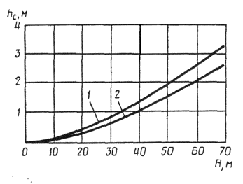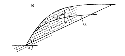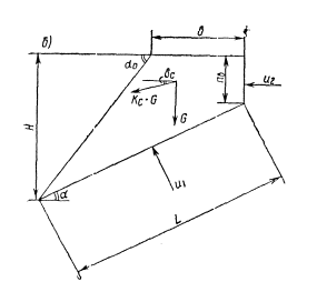 где G - вес рассматриваемого массива*; α - угол падения трещины; L - размер рассматриваемого участка трещин (см. рис. 2); Кс - коэффициент сейсмичности; δ - угол наклона сейсмической силы к горизонту (принимается - наиневыгоднейшим для устойчивости - обычно вектор KcG берется параллельным поверхности смещения); и2 и u1 - силы гидростатического давления, воды соответственно на боковую и низовую грани рассматриваемого массива; Q - сумма проекций на направление смещения приложенных к откосу внешних сил; Р - сумма проекций на нормаль к плоскости смещения приложенных к откосу внешних сил. * Здесь и далее предполагается, что вес скальных откосов (отсеков) определяется с учетом- коэффициента перегрузки п. Устойчивость откосов можно считать обеспеченной, если при всех возможных значениях L, условия, определяемые формулами (1) и (2), удовлетворяются. Для откосов, находящихся под действием только сил собственного веса, требуемая для расчета глубина трещины отрыва hВ (см. рис. 2,б) определяется по выражению