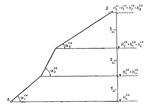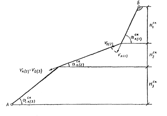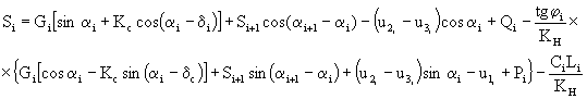 где α0 - угол наклона откоса; γ0 - удельный вес скального грунта. 3.23. Расчеты по схемам В, Г и Д следует выполнять в такой последовательности. Массив, расположенный выше поверхности смещения, условно разбивается вертикальными плоскостями на отсеки (рис. 3). Для каждого из отсеков (для схем В и Г их всего два), начиная с верхнего, находятся дефициты устойчивости Si которые представляют собой внутренние силы взаимодействия между отсеками: