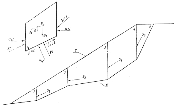 Рис.3. К расчетным схемам В, Г и Д; 1 - 5 - отсеки; 6 - поверхность обрушения; 7 - поверхность склона где Gi - вес рассматриваемого отсека; Si+1 - дефицит устойчивости вышерасположенного отсека, передаваемый на рассматриваемый отсек; αi - угол наклона поверхности смещения в пределах i-го отсека; Li - длина плоскости смещения в основании рассматриваемого отсека; φi, Ci - параметры прочности на сдвиг по плоскости смещения на длине Li,; Qi - сумма проекций на направление сдвига всех внешних сил, действующих на отсек; Рi - сумма проекций на нормаль к поверхности смещения всех внешних сил, действующих на отсек; u1i, u2i, u3i - силы гидростатического давления фильтрующей в трещинах воды на низовую и3 и верховую u2 вертикальные грани отсека, а также на наклонную подошву u1. Предполагается, что направление сил Si совпадает с направлением линии падения соответствующей плоскости смещения (см. рис. 3). В случае, если полученное по формуле (9) значение Si - меньше нуля, в расчет подставляется значение Si = 0. Вычислив дефицит устойчивости для отсека 2 S2, определяют интегральные сдвигающую и удерживающую силы: