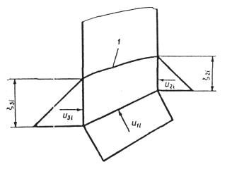 где k - количество блоков, на которые разбивается массив. Оценка устойчивости осуществляется с использованием полученных значений Т и R по выражениям (1) и (2). 3.26. Расчет устойчивости объемного скального блока (см. рис. 1, схема Л), образованного двумя пересекающимися трещинами, рекомендуется производить в соответствии с методикой, приведенной в приложении 5. 3.27. Силы гидростатического давления воды при частичном затоплении отсека (рис. 4) на подошву u1i верховую u2i и низовую u3i вертикальные грани его определяются по зависимостям:
