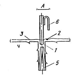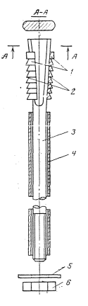 Рис. 8. Распорный анкер: 1 - распорная муфта из двух полугильз; 2 - проволочное кольцо; 3 - стержень; 4 - установочная труба; 5 - опорная шайба; 6 - гайка