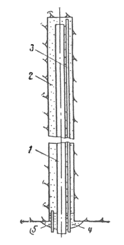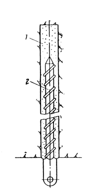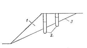Уклон граней клина в клиновых анкерах должен быть не круче 1:12. Резьбу на анкерах (как в опорной, так и в замковой части) предпочтительно выполнять не нарезкой, а накаткой. Поверхности прорези в замке анкера и клина должны быть гладкими. Кромки прорези анкера должны быть закруглены (см. рис. 7), а режущие кромки в торце замка - острыми. Стыки составных анкеров должны быть равнопрочными со стержнем. Длину резьбовых соединений следует делать не менее 40 мм. 4.33. Замки анкеров глубокого заложения выполняются инъекцией цементного раствора (без песка). Для набивных анкеров штанговой крепи (см. рис. 9) рекомендуется применять быстротвердеющие растворы следующего состава: глиноземистый цемент марок 400-500, песок (в соотношении 1:1 к цементу) и вода при водоцементном отношении 0,40-0,45 (с добавкой 5-6% хлористого кальция, считая от массы цемента). Для нагнетаемых анкеров штанговой крепи (см. рис. 10) рекомендуется быстротвердеющий раствор следующего состава: глиноземистый цемент марок 400-500 и вода (при водоцементном отношении 0,45-0,55) с добавкой 6% хлористого кальция от массы цемента. 4.34. Анкеры глубокого заложения для объектов I и II классов (см. п.1.3) следует проектировать в две стадии. На первой (компоновочной) стадии проектирования выбираются тип анкера, материалы для него и устанавливаются основные параметры с ориентацией на такое технологическое оборудование, которое предусматривается для использования в месте установки анкеров. При проектировании анкеров на первой стадии могут применяться имеющиеся аналоги, (см. приложение 8). Вторая стадия проектирования анкеров выполняется после их предварительных испытаний, в ходе которых проверяются несущая способность, работоспособность и отрабатывается технология всех операций по монтажу анкеров. По результатам этих испытаний проект конструкции анкеров корректируется или перерабатывается. 4.35. В проектах анкерных креплений следует предусматривать: а) бурение отверстий для анкеров станками НКР-100,. СБМК-5 или БМК-4 [54], при этом должны уточняться инженерно-геологические свойства пород; б) бурение с инвентарных подмостей при небольшой высоте расположения анкеров; бурение с подвесных подмостей (укрепленных на тросах и передвигаемых лебедкой), со специальных передвижных буровых кареток или с использованием гидроподъемников при высоте, превышающей 4-5 м; в) цементацию стенок скважин густым цементным раствором в случае, если при бурении скважин сильно осыпаются их стенки; после цементации скважины разбуриваются (прочищаются) в течение первых двух суток. Сваи и шпоны4.36. Сваи и шпоны (рис.14, 15) применяются для укрепления массивов со слаборазвитой трещиноватостью, подсеченных поверхностями ослабления, падающими в сторону подошвы откоса (склона) под сравнительно пологими углами (не более 50°). В отличие от анкеров сваи и шпоны располагаются, как правило, в вертикальных (или близких к вертикальным) скважинах при сложных поверхностях смещения укрепляемых массивов (имеющих изменяющиеся по очертанию участки). Сваи и шпоны должны устраиваться таким образом, чтобы они пересекали зону смещения в местах с возможно более пологими углами ее наклона [52].