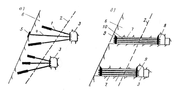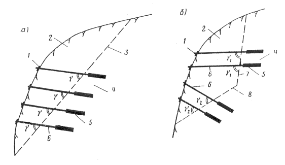 Рис.11. Ориентация анкеров к расчетным поверхностям сдвига: а - при наличии одной расчетной поверхности сдвига; б - при наличии двух расчетных поверхностей сдвига; 1 - оголовок; 2 - неустойчивый массив; 3 - расчетная поверхность сдвига; 4 - устойчивая зона; 5 - анкерный замок; 6 - анкеры; 7 - расчетная крутопадающая поверхность сдвига; 8 - расчетная пологопадающая поверхность сдвига