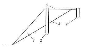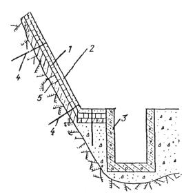 Рис. 22. Конструкция, покрытия у подошвы защищаемого откоса (один из возможных вариантов): 1 - металлическая сетка; 2-слой покрытия;3 - железобетонный лоток; 4 - монтажные анкеры;5 - опорные вкладыши 5.14. В целях ускорения схватывания и твердения растворов в воду для приготовления набрызг-материала вводят специальные добавки в виде жидкости или пасты. В качестве жидких добавок используется раствор калия хлористого (по ГОСТ 450-77), натрия хлористого (по ГОСТ 4233-77), силиката натрия (по ГОСТ 13078-67*) и алюмината натрия. К пастообразным относится добавка НКА (NaF - 1, К2СО3 - 8, раствор NaA103 - 6 вес. ч), применяют также 4-6%-ный раствор НКА в воде. 5.15. Добавки растворов хлористых солей следует применять при производстве укрепительных работ в холодное время года при температуре наружного воздуха не ниже минус 5°С на сухих поверхностях. Рекомендуемые концентрации растворов добавок приведены в табл. 7. Таблица 7