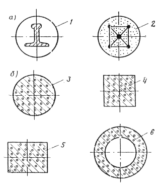 В тех случаях, когда поверхность смещения направлена в сторону подошвы откоса под углами круче 40°, могут быть применены пассивные или активные анкеры глубокого заложения. Для укрепления неустойчивых скальных грунтов необходимо, чтобы свая была заглублена ниже ослабленной зоны на величину, обеспечивающую ее устойчивость. 4.37. Сваи и шпоны следует применять железобетонные двух типов: а) набивные, изготавливаемые на месте производства работ непосредственно в скважинах; в качестве арматуры для них следует использовать железнодорожные рельсы или другой прокат, а также готовые арматурные каркасы (рис. 16, а); б) сборные типовые железобетонные сваи заводского изготовления - сплошные и трубчатые (см. рис.16,б); сплошные сваи имеют круглую, квадратную и прямоугольную формы поперечного сечения; диаметр свай 200-1000 мм. 4.38. Работающие на изгиб сваи должны иметь жесткую арматуру, расположенную таким образом, чтобы наибольший момент сопротивления ее изгибу совпадал с направлением действия изгибающего момента. Для увеличения сопротивления свай изгибу верхние их концы в определенных условиях целесообразно прикреплять к анкерам, расположенным в ненарушенном массиве (см. рис.14). 4.39. Сваи, работающие на изгиб, следует применять трубчатого сечения, а работающие на срез - сплошного сечения [52]. В зависимости от характера деформирования откоса (склона), физико-механических свойств пород и диаметра свай они устанавливаются в один или несколько рядов; при установке свай в два-три ряда верхние их концы должны объединяться общим железобетонным ростверком (рис. 17). 4.40: Несущую способность свай и шпон рекомендуется определять исходя из условий: а) сопротивления сечения на воздействие неуравновешенных сил, обусловленных дефицитом устойчивости закрепляемого массива; б) сопротивления породы, окружающей сваю или шпону (для непрочных скальных пород или грунтов делювиально-элювиального шлейфа). При этом сечение свай должно проверяться на срез и изгиб, а сечение шпон - только на срез. При расчетах следует пользоваться имеющимися рекомендациями [52]. 4.41. Перед нагнетанием скважины для установки свай и шпон должны промываться водой. Арматура в пробуренные и очищенные скважины должна опускаться автокраном или. лебедкой. Пространство между арматурой и стенками скважины должно заполняться бетоном или раствором. Для приготовления раствора следует использовать растворомешалки, а для его подачи - растворонасосы. Подача раствора от насоса к скважине осуществляется с помощью гибких высоконапорных шлангов с последующим уплотнением в скважине электровибратором. Техническая характеристика применяемых растворомешалок, бетононасосов и электровибраторов приведена в [46]. Инъектирование трещин4.42. В качестве вяжущих при инъектировании трещин следует применять цементные и коллоидные химические растворы, эпоксидные смолы. Для повышения проникания цементного раствора в мелкие трещины в него добавляют водные растворы жидкого стекла, кремнекислого натрия или сульфата аммония. При этом рекомендуется применять портландцемент марки не ниже 300. Для заделки мелких трещин следует применять глиноземистый цемент или же осуществлять нагнетание химических растворов. Для инъекции в породы, содержащие напорные подземные воды, применяются быстросхватывающиеся цементы. В ка