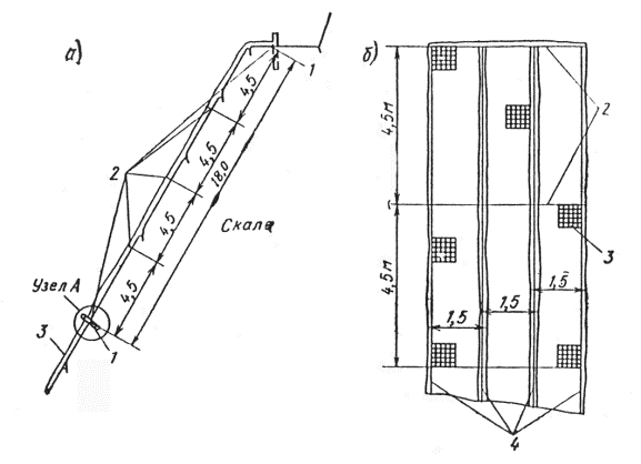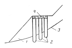 Рис. 20. Конструкция защитного покрытия откоса: 1 - несущий анкер; 2 - слой покрытия по металлической сетке; 3 - отверстия для выпуска веды; 4 - монтажные анкеры
