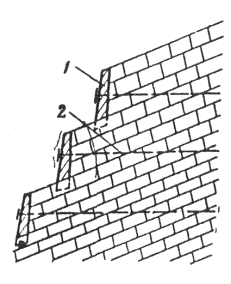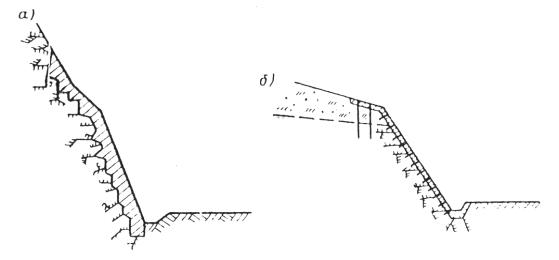 Рис.18. Подпорные стены с анкерами: 1 - подпорные бетонные стены; 2 - металлические анкеры 4.46. Применение комбинированных конструкций должно обусловливаться наличием инженерно-геологических и местных особенностей, удовлетворяющих одновременно условиям применения нескольких видов укрепительных и защитных сооружений. При проектировании комбинированных конструкций на отдельные их элементы следует распространять соответствующие требования, выполнение которых необходимо для составляющих видов конструкций. 4.47. Укрепление отдельных крупных скальных глыб тросовыми обвязками (в том числе в совокупности с сетками) выполняется путем прижатия массива горизонтальными (или вертикальными) тросами, закрепленными в устойчивые участки по обеим сторонам скальной породы. По концам тросов следует устраивать винтовые стяжки. Это мероприятие может применяться как промежуточное перед началом выполнения основных укрепительных работ. 5. ПРОЕКТИРОВАНИЕ ЗАЩИТЫ ОТКОСОВ ОТ ВЫВЕТРИВАНИЯОсновные положения 5.1. Защиту откосов (склонов) от выветривания и разрушения целесообразно осуществлять в тех случаях, когда общая устойчивость откосов или склонов обеспечена, а использование других средств защиты затруднительно. 5.2. Защита откосов возможна путем устройства облицовочных (одевающих) стен (рис. 19, а), нанесения на поверхность откосов и склонов различных вяжущих по предварительно установленной сетке пневмонабрызгом (см. рис. 19,б) или посредством-проведения агролесомелиоративных мероприятий. 5.3. Целесообразность применения защитных мероприятий устанавливается в зависимости от высоты и крутизны откоса (склона), свойств скальных грунтов, наличия местных строительных материалов, машин и оборудования. 5.4. Облицовочные (одевающие) стены рекомендуется применять при высоте откоса 5-10 м там, где поверхность его неровная и имеется в наличии местный материал. 5.5. Покрытие откосов пневмонабрызгом (торкрет-бетоном, набрызг-бетоном и аэроцемом) следует предусматривать на предварительно навешенную и укрепленную анкерами металлическую сетку.