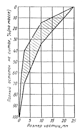 Рис. 23. Допустимая область рассева заполнителей при набрызг-бетоне 5.18. Покрытие из набрызг-бетона должно выполняться по металлической сетке с ячейками размером не менее 50×50 мм. Толщину покрытия следует принимать не менее 50 мм. Набрызг-бетон, помимо цемента и песка, включает в себя более крупные фракции заполнителя, представленные гравием или щебнем (до 20-25 мм). Заполнитель должен удовлетворять требованиям ГОСТ 8267-75 (для щебня), ГОСТ 8736-77 (для песка) Совмещенная кривая рассева гранулометрического состава заполнителя должна укладываться в заштрихованную зону (рис. 23). Влажность заполнителя не должна превосходить 5% (по массе). Водоцементное отношение должно приниматься в пределах 0,40-0,50 (с учетом влажности: заполнителя). Требования к цементу и воде при приготовлении набрызг-бетона см. в пп. 5.13 и 5.17. 5.19. Аэрированные цементнопесчаные растворы (аэроцем) представляют собой смесь из цемента, песка, воды и вспенивающей добавки. Вспенивающие добавки могут быть жидкими и порошкообразными. Применяемые вспенивающие добавки отличаются между собой содержанием активного вещества; перечень наиболее часто употребляемых добавок приведен в табл. 8. Таблица 8