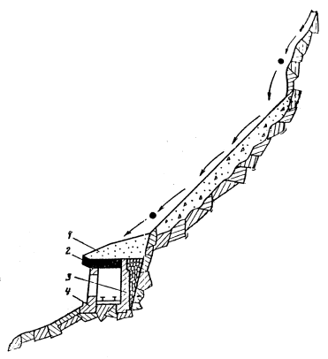 Рис.25. Схема противообвальнойгалереи: 1 - амортизирующая отсыпка; 2 - перекрытие; 3 - нагорная стена; 4 - низовая опора 6.13. Защитные противообвальные галереи следует размещать на обвальных участках железных, автомобильных и пешеходных дорог в случаях, когда устройство более простых противообвальных устройств и сооружений практически неосуществимо или экономически нецелесообразно [1]. При этом очаги обвала должны находиться на достаточном расстоянии от галерей, исключающем возможность прямого падения на их кровлю скальных обломков (рис. 25). 6.14. Для уменьшения динамического воздействия скальных обломков на противообвальные улавливающие стены и галереи необходимо устраивать амортизирующие грунтовые отсыпки. В улавливающих сетях с этой целью рекомендуется устраивать дублирующие оттяжки. Улавливающие сооружения6.15. Проектирование противообвальных улавливающих стен должно включать определение габаритных размеров сооружений, а также расчет их на прочность и устойчивость [2, 63]. 6.16. Габаритные размеры улавливающих устройств и сооружений следует назначать из условия исключения возможности перелета и выскакивания скальных обломков, падающих со склона. Габаритные размеры стен следует определять расчетом на перелет, выкатывание и подскакивание скальных обломков. Расчетом наперелет определяются высота стен и их месторасположение. Расчетом на выкатывание и подскакивание устанавливается необходимая глубина застенных пазух, при которой исключается возможность попадания скальных обломков на защищаемый объект. 6.17. Прочность и устойчивость конструкций улавливающих устройств и сооружений следует проверять на статическую нагрузку от амортизирующей отсыпки и обвальных масс, а также на удар скальных обломков. 6.18. Проектирование противообвальных улавливающих стен должно выполняться в такой последовательности: - определение расчетной, скорости падающих скальных обломков в зоне расположения сооружения; - установление расчетной величины падающих обломков; - определение габаритных размеров стен; - расчет на статическую нагрузку основных размеров несущей конструкции сооружения; - проверка несущей конструкции сооружения на динамическую нагрузку от удара скальных обломков. 6.19. Расчетную скорость падающих обломков рекомендуется определять в зависимости от типа поперечногопрофиля нагорного откоса или склона (приложение 11 [2]). Расчетная скорость может быть также определена па ЭВМ [67] (приложение 12). 6.20. Расчетная величина скальных обломков определяется на основании статистических характеристик распределения их фактической крупности по многолетним наблюдениям за падением обломков скальных грунтов в пределах защищаемого участка. При отсутствии многолетних наблюдений за падением скальных обломков их расчетная величина может определяться в зависимости от потенциальной блочности скальных грунтов [68], слагающих откос или склон (приложение 13), и уточняться путем опытного их сбрасынания с нагорного откоса (склона) по направлению эксплуатируемого или проектируемого объекта. Расчет может произподиться также на ЭВМ (см. приложение 12). 6.21. Габаритные размеры противообвальных улавливающих стен рекомендуется определять по таблицам и графикам [63] в соответствии с методикой, приведенной в приложении 14. 6.22. Расчет противообвальных защ