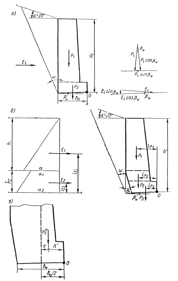 где Еi - составляющие удерживающих сил (рис. 26, а); li, - плечи составляющих удерживающих сил относительно оси, проходящей через переднее нижнее ребро подошвы фундамента стены; Мопр - расчетный момент опрокидывающих сил: