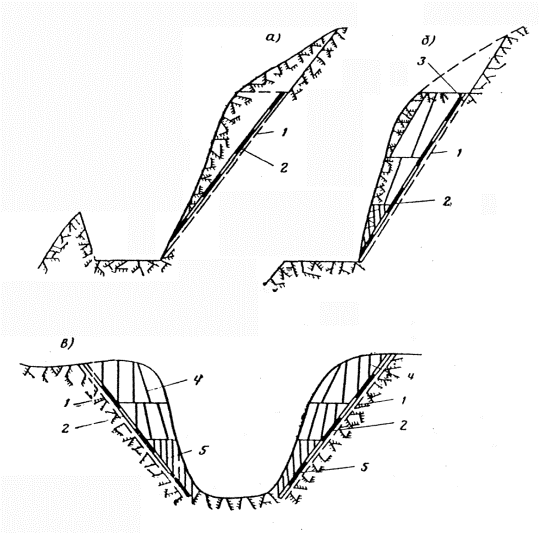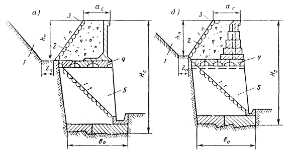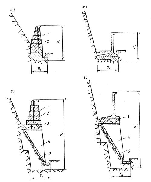 Рис.29. Конструкции противообвальных улавливающих стен (массивные и сборные): а - массивная стена из бетонных блоков; б - массивная стена из бутобетона; в - массивная стена из бетонных блоков с. разгружающей площадкой; г - стена из сборного железобетона уголкового профиля; 1 - улавливающая пазуха; 2 - амортизирующая отсыпка; 3 - выкладка откоса крупным камнем; 4 - бетонные блоки; 5 - арматура