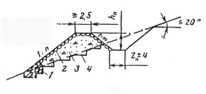 Рис. 32. Схема устройства улавливающего вала на косогоре до 20°: 1 - упор из каменной кладки; 2 - укрепление откоса; 3 - вализ местного грунта; 4 - уступы в основании вала (штрабы) Поверхность откосов между контрфорсами целесообразно покрывать, но предварительно устанавливаемой сетке различными вяжущими путем их пневмонабрызга в соответствии с гл. 5 настоящего Руководства. 6.32. При проектировании противообвальных улавливающих валов, траншей и полок следует определять их габаритные размеры расчетом на перелет, выкатывание и подскакивание скальных обломков в зависимости от их расчетной скорости в соответствии с п. 6.19. 6.33. При крутизне склонов до 20° и толщине делювиального покрова более 1 м улавливающие валы на склоне рекомендуется возводить из местных грунтов в соответствии с рис. 32. При крутизне склонов 20-25° низовому откосу вала следует придавать крутизну 1:1 (рис. 33), укрепляя его каменной выкладкой на цементном растворе. При этом у подошвы низового откоса вала в обоих случаях необходимо устраивать упор из бутовой или бутобетонной кладки (см. рис. 32 и 33). Улавливающие валы у подошвы откосов и склонов сооружают из местного грунта без создания специального упора в основании наружного откоса. 6.34. Конструкции улавливающих траншей [60] и полок в зависимости от местных условий могут проектироваться заглубленного типа или на уровне защищаемых объектов с устройством .оградительных сооружений (см. рис. 24, а и б). 6.35. Размеры и форму улавливающих пазух противообвальных сооружений следует назначать в зависимости от скорости и размеров падающих скальных обломков [1]. При скорости падения обломков до 20 м/с улавливающие пазухи следует устраивать в соответствии с рис. 34, а. При этом крутизну откоса амортизирующей отсыпки допускается увеличивать до 1:0,75 с укреплением его камнем в один ряд. Габаритные размеры улавливающей пазухи принимаются по расчету на выскакивание согласно приложению 14. При скорости падения обломков более 20 м/с в верхней части отсыпки следует размещать ограничительную стену (см. рис. 34, б). При этом крутизну откоса амортизирующей отсыпки рекомендуется назначать от 1:1,25 до 1:1,5 без укрепления. На тех участках, где предполагается падение обломков малого объема, взамен ограничительной стены допускается использовать верхнюю незасыпанную часть задней грани основной стены (рис. .34, в). 6.36. Крутизна откосов улавливающих пазух с нагорной стороны назначается в зависимости от расположения точки М, удар обломков в которую создает наиневыгоднейшую траекторию его движения (см. рис. 34).