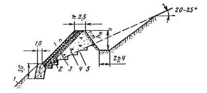 Рис. 33. Схема устройства улавливающего вала на косогоре 20-25°: 1 - поверхность косогора; 2 - контрбанкет из бутобетонной кладки; 3 - каменная выкладка; 4 - укрепление откоса; 5 - вал из местного грунта