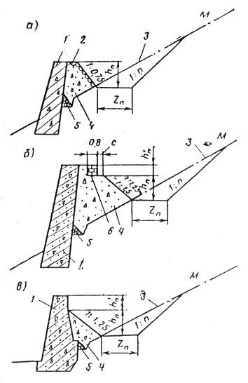 Рис.34. Схемы улавливающих устройств (пазух): а - при расчетных скоростях движения камней до 20 м/с; б, в - то же свыше 20 м/с; 1 - стена; 2 - укрепление поверхности откоса; 3 - поверхность косогора, до возведения улавливающих устройств; 4 - амортизирующая отсыпка; 5 - застенный дренаж; 6 - ограничительная стенка; hn - высота отсыпки; h'n - высота стенки-ограничителя; Zn - ширина дна улавливающей траншеи