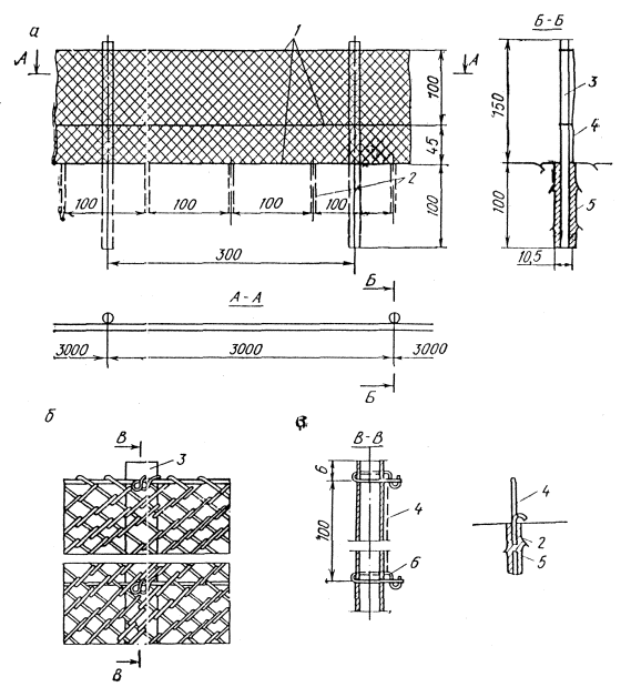 Рис. 35. Фрагмент сетчатого ограждения: а - общий вид; б - деталь крепления сетки к стойке; в - крепление сетки анкерами к скале; 1 - стержни или тросы диаметром 10 мм, протянутые через ячейки сетки; 2 - крепление сетки анкерами диаметром 18 мм к скале; 3 - труба диаметром 76 мм; 4 - сетка с ячейками 50х50 мм; 5 - цементный раствор I : 2; 6 - проволока диаметром 1 мм 6.39. Сетчатые ограждения в виде вертикальных заборов служат для защиты объектов от завалов осыпями или от падения с небольших высот отдельных обломков скального грунта. Опорами вертикально расположенных сеток служат железобетонные или металлические столбы. Сетки должны находиться в слабонатянутом состоянии, что увеличивает их способность поглощать энергию падающих скальных обломков.