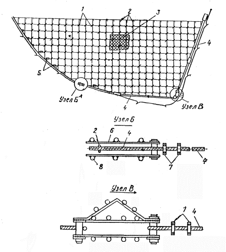 Рис. 36. Тросово-сетчатая ловушка: 1 - сжимы на пересечениях тросов; 2 - трос диаметром 22 мм с шагом 2 м; 3 - сетка рабица в два слоя; 4 - трос диаметром 35,5 мм якорный; 5 - винтовые стяжки; 6 - пластина 20х200 мм; 7 - сжимы; в - анкеры клинощелевые диаметром 36 мм 6.40. Тросово-сетчатые ограждения преимущественно применяются на склонах для задержания скальных обломков. В отдельных случаях они целесообразны для перекрытия обвально-опасных логов (см. рис. 36). Конструкция представляет собой закрепленные клиновыми анкерами якорные тросы, к которым специальными соединениями подвешивается сетка из тросов. 6.41. Высота сетчатых заборов и тросово-сетчатых ловушек должна назначаться в соответствии с рекомендациями, приведенными в п. 6.16, из расчета на перелет и подскакивание обломков (см. приложение 14). 6.42. Защитные навесные сетки устраиваются на участках откосов или склонов, где возможны местные обрушения и отдельные вывалы обломков скального грунта. Конструкция представляет собой закрепленную анкерами сетку, покрывающую поверхность откоса (склона) для предотвращения попадания обломков на защищаемый объект (см. рис. 37).