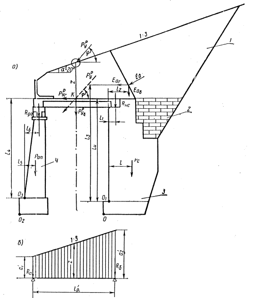 Расчет на прочность основания стены осуществляется путем проверки напряжений по подошве фундамента согласно п. 6.26 настоящего Руководства. Расчет на прочность и устойчивость речной опоры галереи выполняется также относительно обреза фундамента (точки О3) и его подошвы (точки О2). При этом расчетные значения моментов противодействия опрокидыванию относительно обреза фундамента (см. рис. 38,а) определятся из выражения Mуд = Poпl5n + Rроl6n, (54) где Rpo = Ra + Рa + Рриг + Роп - нагрузка от веса опоры; Ra - нагрузка от веса амортизирующей отсыпки на речную опору (см. рис. 38,б); Ра - нагрузка от веса перекрытия на речную опору; Рриг - нагрузка от веса ригеля;