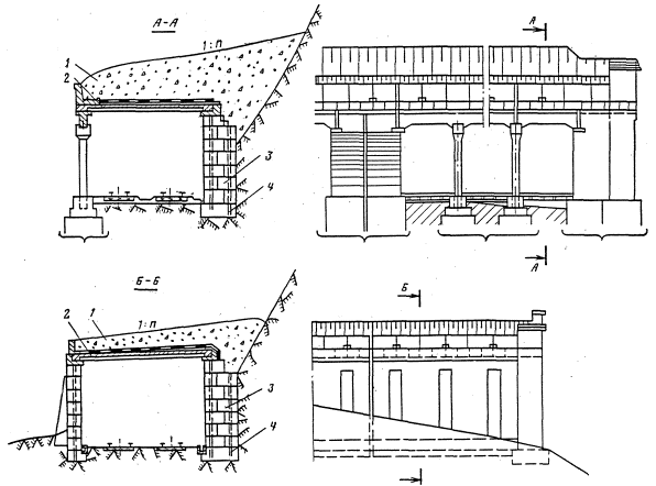 Рнс. 38. Расчетная схема галереи: 1 - амортизирующая грунтоваяотсыпка; 2 - сухая кладка; 3 - нагорная стена; 4 - речная опора При этом расчетные значения моментов противодействия опрокидыванию нагорной стены относительно обреза фундамента (точки-O1) определяются из выражения