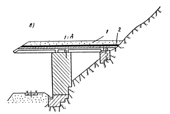 Рис. 40. Противообвальные галереи рамного (а), арочного (б) и консольного (в) типов: 1 - амортизирующая отсыпка; 2 - слой изоляции 6.57. Защитные галереи при сплошных низовых опорах (в виде стен) должны иметь ниши сечением 2х2 м, глубиной 1 м. Их надо располагать через 60 м в шахматном порядке. При открытых низовых опорах ниши должны устраиваться только с нагорной стороны. 6.58. Для уменьшения длины противообвальных галерей при наличии соответствующих местных условий в предпортальных их частях необходимо устраивать противообвальные улавливающие стены. 6.59. Низовые и верховые опоры галерей следует выполнять из сборных железобетонных конструкций (или бетонных блоков) с надежным омоноличиванием. 6.60. Для уменьшения объема верховых опор могут применяться разгружающие консоли и контрфорсы, а при расположении их у скального косогора выполняют анкеровку опор. 6.61. Низовые и верховые сборные железобетонные опоры в пределах каждой секции должны быть объединены поверху продольными ригелями, соединенными между собой штырями. 6.62. Фундаменты опор смежных секций галерей следует закладывать, как правило, на одном уровне. Допускается заложение фундаментов опор смежных секций галерей на разных отметках, при этом для нескальных грунтов переход от высоких к низким отметкам допускается уступами высотой не более 0,5 м. 6.63. Сборные железобетонные перекрытия галерей балочного типа необходимо конструировать из Т-образных бездиафрагменных балок. Балки сборных перекрытий в пределах каждой секции должны быть объединены между собой путем сварки закладных деталей или шпоночными соединениями. 6.64. Гидроизоляция перекрытия должна проектироваться согласно требованиям главы СНиП «Кровли, гидроизоляция, пароизоляция и теплоизоляция». 6.65. Для обеспечения водоотвода на кровле галереи требуется предусматривать устройство бетонных лотков, консольных водосбросов, водоотводных трубок приёмных колодцев и т.п. Поверхности гидроизолирующего слоя на кровле галерей необходимо придавать уклон в низовую сторону. Для отвода грунтовых вод, поступающих к галерее с верховой стороны, должно быть предусмотрено устройство продольного застенного дренажа, связанного с водоприемными колодцами. 6.66. В проектах по устройству галерей должны предусматриваться следующие основные требования к технологии производства и безопасности работ: - при строительстве галерей со сборными опорами с низовой стороны монтаж их следует начинать с установки опор (колонн) в железобетонные подколонники (стаканы), которые должны опираться на массивный фундамент; - ригели при монтаже должны удерживаться в нужном положении подъемными устройствами и насаживаться сквозными отверстиями на металлические штыри, заделанные в колоннах, с последующей заливкой отверстий бетонным раствором; - балки перекрытия должны омоноличиваться поверху галерей, а с нагорной стороны дополнительно заделываться специальными арматурными выпусками в кладку нагорной стены; - устройство амортизирующей отсыпки над галереями надлежит выполнять в процессе строительства или немедленно после его завершения из местного или привозного грунта автосамосвалами. Для подачи грунта автосамосвалами на кровлю галереи за нагорной стеной должны устраиваться въезды или эстакады шириной не менее 4 м. Для развертывания машины па кровле