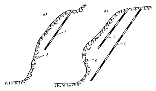Рис.13. Схемы анкеровки откосов и склонов изнутри массивов: а-вееры одиночных анкеров в скважинах; б-пакеты анкеров в анкерных штольнях; 1 - анкеры в глухих скважинах; 2 - расчетная поверхность сдвига; 3 - штольня продольная; 4 - анкер в сквозной скважине; 5 - опора сквозного анкера; 6 - закрепляемый массив; 7 - штольня поперечная; 8 - анкерная балка или плита; 9 - натяжной оголовок; 10 - пакет сквозных анкеров в поперечной штольне Анкерную (штанговую) крепь в основном назначают конструктивно для закрепления приповерхностного слоя толщиной до 3 м от разуплотнения и осыпания, а также для закрепления крупноглыбовых отдельностей размером до 2-3 м (по нормали к поверхности откоса или склона). Расстояние между анкерами крепи следует определять из условия обеспечения устойчивости блоков между анкерами, но не менее 1 м. 4.28. Сечение пассивных анкеров определяется из расчета на растяжение, изгиб и срез, сечение активных (предварительно-напряженных) анкеров - лишь из расчета на растяжение. Длина замковой части как активных, так и пассивных анкеров определяется из условий выдергивания стержня из цементного камня (бетона), выдергивания цементного камня из скважины и выдергивания вследствие разрушения пород вокруг замка. Для активных анкеров при расчетах их параметров учитывается максимальное усилие предварительного натяжения. Для пассивных анкеров при расчетах в качестве исходного усилия применяется дополнительная удерживающая сила, компенсирующая недостаток (дефицит) устойчивости, приходящийся на один анкер. 4.29. При выборе угла наклона анкеров к расчетной поверхности смещения закрепляемого массива γ (см. рис. 6) необходимо учитывать следующее: а) несущая способность анкеров зависит от их ориентации относительно поверхности скольжения в вертикальной плоскости; б) при расположении анкеров нормально к поверхности предполагаемого скольжения, т. е. при γ = 90°, стабилизирующее действие достигается лишь за счет сил трения, пропорциональных величине нормального давления, создаваемого за счет предварительного натяжения в активных анкерах или за счет реактивных усилий при смещении закрепляемых массивов в пассивных анкерах; в) если анкеры ориентированы относительно поверхности предполагаемого смещения под углами, отличными от 90°, то, помимо сил трения, обусловленных нормальной составляющей, возникают тангенциальные усилия, которые увеличивают (при γ < 90°) или уменьшают (при γ > 90°) устойчивость закрепляемого массива; г) целесообразно анкер ориентировать к поверхности вероятного смещения закрепляемого массива под углом γ < 90°; рекомендуемая величина этого угла 30-60°. 4.30. Общая длина анкера La (см. рис.6) складывается из длины замка 13 или глубины заделки в зону сохранных пород На, длины наружной его части, выступающей за пределы откоса lк, и длины участка между наружной и замковой частями lсв. Длина замка определяется расчетом (см. п. 4.28), за исключением клиновых и распорных анкеров, для которых она назначается конструктивно по имеющемуся опыту или по результатам испытаний. Длина наружной части назначается по конструктивным соображениям в зависимости от типа анкеров и особенностей материала и формы опоры (подхвата). Длина участка между наружной и замковой частями обусловливается инженерно-геологическими особенностями закрепляемого скального массива, в ч