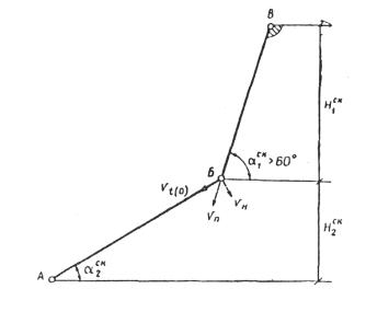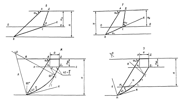 Обрушение откосов, изображенных на рис. 1 (схема В), возможно лишь при образовании в массиве пологопадающей ослабленной зоны (трещины), показанной пунктиром на рис. 1. Такая трещина возникает обычно у подножия высоких откосов, где действующие напряжения могут превосходить прочность породы на сжатие. Параметры прочности на сдвиг по трещине и ее ориентацию рекомендуется определять на месте с помощью полевых опытов и геологической съемки. Для предварительных расчетов устойчивости параметры прочности на сдвиг по трещине допускается определять в соответствии с п. 3 приложения 2, а угол ее падения выбирать из условия минимальной устойчивости (проводится серия расчетов при разных углах α1). Для облегчения построения вероятных поверхностей обрушения при расчетах по схемам В и Г можно воспользоваться рекомендациями, приведенными в приложении 3. При построении их влияние фильтрационных и сейсмических сил не учтено. 3.24. Расчет по схеме Е, учитывающей наличие секущих призму обрушения крупных трещин, рекомендуется проводить графоаналитическим способом путем построения многоугольников сил. Пример последовательности расчета для откоса, состоящего из двух отсеков, приведен в приложении 4. 3.25. Расчет по схемам Ж, З, И, К выполняется следующим образом. Эти схемы объединяют участки криволинейной монотонной поверхности скольжения и верхнего вертикального отрезка Н90. Последний подсчитывается по формуле (31, 33)