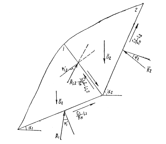 где φм - угол внутреннего трения в массиве (численно φм = φк). Устойчивость скальных откосов рассчитывается по методу алгебраического суммирования. Призма возможного обрушения разбивается вертикальными линиями на ряд блоков, взаимодействие между которыми не учитывается. Количество блоков зависит от крутизны поверхности скольжения. Следует стремиться к тому, чтобы в пределах блока криволинейную поверхность можно было бы заменить плоской, с таким расчетом, чтобы разница в крутизне спрямляемых участков поверхности скольжения не превышала 5°. Сдвигающие и удерживающие силы для i-го блока подсчитываются по формулам: