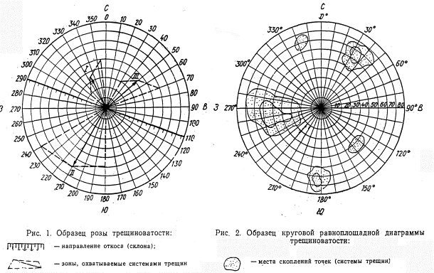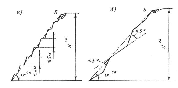 3. ПРОЕКТИРОВАНИЕ ОТКОСОВ СКАЛЬНЫХ ВЫЕМОКОсновные положения3.1. В процессе проектирования скальных откосов и оценки состояния естественных склонов следует осуществлять прогнозирование (расчет) их общей и местной устойчивости. На основании порученных результатов расчетов устанавливаются оптимальные в технико-экономическом отношении очертания откосов. При этом следует исходить из условия обеспечения их общей устойчивости в сочетании с минимумом строительных и эксплуатационных расходов с учетом отдаленности затрат 3.2. Расчет общей устойчивости требуется для установления очертания откоса, при котором эта устойчивость обеспечивается с определённой надежностью. Оценка местной устойчивости необходима для прогнозирования интенсивности осыпания продуктов выветривания с откосов в процессе эксплуатации и возможности появления поверхностных сплывов. 3.3. Оценка устойчивости скальных откосов имеет свою специфику, обусловленную особенностями строения скальных массивов, являющихся структурно-анизотропными (неоднородными) средами, что накладывает определенные условия на расчетные схемы и требует тщательной регистрации инженерно-геологических особенностей массива в естественном залегании. 3.4. Устойчивость откосов следует оценивать в зависимости от их очертания, характера и расположения поверхностей ослабления (трещиноватости, слоистости) по отношению к проектируемому откосу, прочностных параметров грунтов и устойчивости их по отношению к выветриваемости во времени, а также от внешних нагрузок, гидрогеологических условий (обводненности пород) и интенсивности сейсмического воздействия. Расчет общей устойчивости3.5. Расчет устойчивости склонов (откосов) при бытовом (природном), проектном и промежуточных очертаниях следует производить по первому предельному состоянию - несущей способности (по условиям предельного равновесия) [1]. Для определения устойчивости скальных откосов и склонов используется метод предельного равновесия. Расчет устойчивости заключается в оценке дефицита устойчивости S (разности между сдвигающими и удерживающими силами) как для всего откоса или склона запроектированной (имеющейся) конфигурации в целом, так и для отдельных его блоков или отсеков: