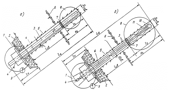4.17. Анкерная (штанговая) крепь в зависимости от инженерно-геологических условий может быть конструктивно оформлена в виде одиночных анкеров с опорными шайбами (плитами); групповых анкеров с подхватами (железобетонными, металлическими или деревянными); анкеров в сочетании с металлическими сетками, покрывающими пространство между анкерами; комбинированных конструкций (например, сочетаний анкерных креплений с покрытием участков откоса между ними пневмонабрызгом по сетке и др.). Одиночные анкеры следует применять в монолитных и слаботрещиноватых прочных скальных грунтах. Анкерами с подхватами, объединяющими их, следует крепить откосы в скальных грунтах, менее прочных и в большей степени разбитых трещинами, чем в предшествующем случае. Анкеры в сочетании с металлическими сетками следует использовать при мелкоглыбовой раздробленности скальных грунтов откосов (там, где возможны вывалы и отслоения). Комбинированные конструкции рекомендуется применять при невыдержанности инженерно-геологических условий в пределах закрепляемого массива. 4.18. Активные анкеры глубокого заложения применяются одновременно с устройством монолитных железобетонных опор (индивидуальных или групповых), оформленных в виде горизонтальных поясов, вертикальных ребер или контрфорсов, а также в виде железобетонных решеток, одевающих или подпорных стен [51]. Пассивные анкеры глубокого заложения могут быть установлены с подхватами и опорными плитами аналогично анкерной крепи. Поверхность скалы в промежутках между анкерами глубокого заложения при необходимости может быть закрыта сеткой, анкерной крепью или комбинациями этих (и других) конструкций. 4.19. В качестве подхватов (упорных балок) для групповых анкеров рекомендуется применять прокатные профили или железобетонные балки. После установки подхватов зазор между ними и откосом следует заполнять бетоном для предотвращения выветривания пород под подхватом [52]. 4.20. Анкерную крепь рекомендуется выполнять в виде стержней (штанг) из стальной арматуры и других материалов, закрепляемых различными вяжущими или механическим способом. Анкеры глубокого заложения следует выполнять из стержневой арматуры (одного или нескольких стержней), пучков высокопрочной арматурной проволоки и арматурных канатов. Допускается применение стальных канатов (обычных тросов). 4.21. Анкеры могут закрепляться или лишь в концевой их части, или по всей длине*. Анкеры, закрепляемые в скальном грунте лишь в концевой их части, имеют замок, располагающийся за пределами зоны возможного обрушения; наружный участок на поверхности откоса, где располагается опора или натяжное приспособление; анкерный тяж (стержень), передающий нагрузку от опорной части на замковую (см. рис. 6). */ Пассивные анкеры, закрепляемые по всей длине, иногда называют нагелями. 4.22. При выборе типа анкера руководствуются следующими соображениями [50, 52]: - анкеры без предварительного напряжения в основном предназначаются для работы на срез и изгиб, а анкеры с предварительным напряжением - для случаев, когда преобладает нагрузка, вызывающая растягивающие напряжения в направлении анкера; - анкеры глубокого заложения имеют несущую способность значительно большую, чем анкерная крепь (достигающую 500-1000 кН и более); - клиновые (клинощелевые) анкеры просты по устройству и обл